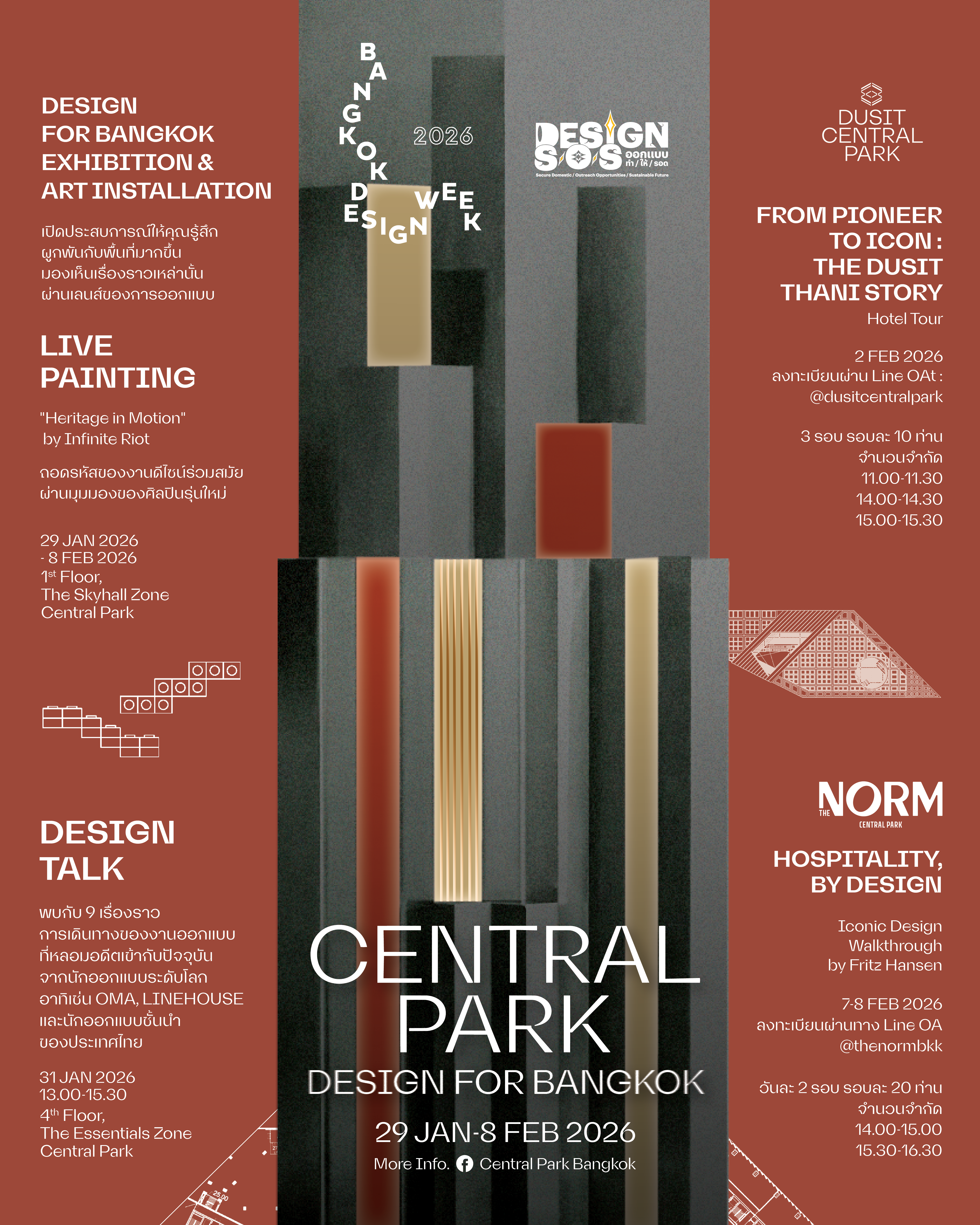 ซึ่งในเทศกาลแห่งการออกแบบ BKKDW 2026 ที่จะถึงนี้ ‘คุณณอต’ คุณายุธ เดชอุดม ผู้ช่วยกรรมการผู้จัดการสินทรัพย์ Central Park เขาเลยเริ่มไอเดีย นำเสนอทุก ๆ มิติของการ “ดีไซน์” ในนี้ ให้ทุกคนได้เข้ามาสัมผัส ไม่ว่าจะเป็นนิทรรศการที่เจาะลึกมิติเบื้องหลังของโครงการ ไปจนถึง Art Installation ‘Heritage in Motion’ ขนาดมหึมาสูงกว่า 7 เมตร ทั้งหมดนี้มาจากความตั้งใจจะถ่ายทอด DNA การออกแบบอันเป็นเอกลักษณ์ของโครงการออกมาเป็นประสบการณ์ที่จับต้องได้ เพื่อให้คนกรุงเทพฯ ได้สัมผัสถึงความมุ่งมั่นของเซ็นทรัลพัฒนาที่ต้องการยกระดับมาตรฐานใหม่ของเมืองผ่านงานศิลปะและการออกแบบอย่างแท้จริง